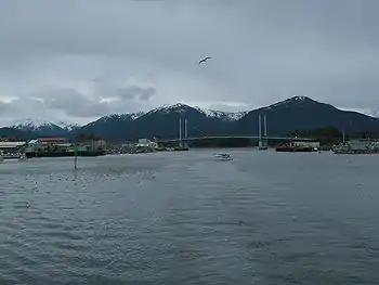 The Sitka Channel, or more commonly referred to as simply The Channel by locals, is a notable feature of Sitka, Alaska that separates vital portions of infrastructure located on the peripheral Japonski Island from the rest of the community. Until 1972 the commute was only achievable through a schedule of shore boats that carried an estimated 1,000 people a day for 26 years.[1] The ferries were retired when the John O'Connell Bridge was constructed (named after John W. O'Connell, a former mayor of Sitka).
