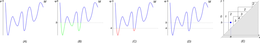 An example of size function. (A) A size pair , where is the blue curve and is the height function. (B) The set is depicted in green. (C) The set of points at which the measuring function takes a value smaller than or equal to , that is, , is depicted in red. (D) Two connected components of the set contain at least one point in , that is, at least one point where the measuring function takes a value smaller than or equal to . (E) The value of the size function in the point is equal to .
