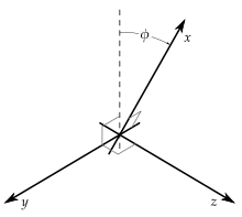 The simplest 3D case of a skew coordinate system is a Cartesian one where one of the axes (say the x axis) has been bent by some angle , staying orthogonal to one of the remaining two axes. For this example, the x axis of a Cartesian coordinate has been bent toward the z axis by , remaining orthogonal to the y axis.