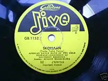 "Skokiaan" is a popular tune originally written by Zimbabwean musician August Musarurwa (d. 1968, usually identified as August Msarurgwa on record labels) in the Tsaba-tsaba big band-style that succeeded Marabi. Skokiaan (Chikokiyana in Shona)[1] refers to an illegal self-made alcoholic beverage typically brewed over one day that may contain ingredients such as maize meal, water and yeast, to speed up the fermentation process.[2][3] The tune has also been recorded as "Sikokiyana", "Skokiana", and "Skokian".