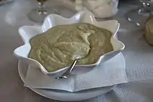 Skordalia or skordhalia or skorthalia (Greek: σκορδαλιά [skorðaˈʎa], also called αλιάδα, aliada/aliatha), or Tarator in Turkish, is a thick purée in Greek cuisine and Turkish Cuisine made of garlic in a base of potatoes, walnuts, almonds or liquid-soaked stale bread mixed with olive oil in to make a smooth emulsion, to which some vinegar is added.[1][2] It is usually made in a mortar and pestle. Skordalia is served as a sauce, side dish, or dip.