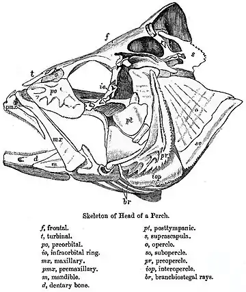 In ray-finned fish, there has also been considerable modification from the primitive pattern. The roof of the skull is generally well formed, and although the exact relationship of its bones to those of tetrapods is unclear, they are usually given similar names for convenience. Other elements of the skull, however, may be reduced; there is little cheek region behind the enlarged orbits, and little, if any bone in between them. The upper jaw is often formed largely from the premaxilla, with the maxilla itself located further back, and an additional bone, the symplectic, linking the jaw to the rest of the cranium.[9]