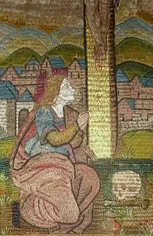 Adam was believed to have been buried on Mount Calvary. Silk embroidery (17th century).