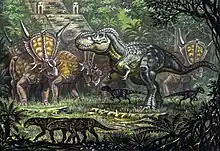 - Ligocristus – A hadrosaur that is fed upon by a Foetodon. They resemble Saurolophus a hadrosaur from the Cretaceous.[9]
