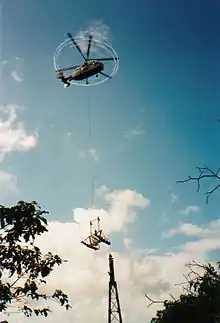 The 32 towers at Skyrail were built in 10×10 m clearings, and workers had to sterilise equipment and footwear before entering sites. Russian Kamov helicopters were used extensively to carry equipment, materials and cement to tower sites and rainforest stations. Helicopters carried 900 tonnes of steel, cement and building materials into the Barron Falls Station alone. Because no roads were built during construction, workers walked to the tower sites each day with their equipment.[24]