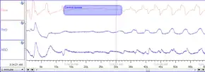 - Physiologic effects of central apnea: During central apneas, the central respiratory drive is absent, and the brain does not respond to changing blood levels of the respiratory gases. No breath is taken despite the normal signals to inhale. The immediate effects of central sleep apnea on the body depend on how long the failure to breathe endures. At worst, central sleep apnea may cause sudden death. Short of death, drops in blood oxygen may trigger seizures, even in the absence of epilepsy. In people with epilepsy, the hypoxia caused by apnea may trigger seizures that had previously been well controlled by medications.[64] In other words, a seizure disorder may become unstable in the presence of sleep apnea. In adults with coronary artery disease, a severe drop in blood oxygen level can cause angina, arrhythmias, or heart attacks (myocardial infarction). Longstanding recurrent episodes of apnea, over months and years, may cause an increase in carbon dioxide levels that can change the pH of the blood enough to cause a respiratory acidosis.