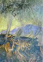 The Brothers Grimm included a variant of Sleeping Beauty, Little Briar Rose, in their collection (1812).[17] Their version ends when the prince arrives to wake Sleeping Beauty (named Rosamund) and does not include the part two as found in Basile's and Perrault's versions.[18] The brothers considered rejecting the story on the grounds that it was derived from Perrault's version, but the presence of the Brynhild tale convinced them to include it as an authentically German tale. Their decision was notable because in none of the Teutonic myths, meaning the Poetic and Prose Eddas or Volsunga Saga, are their sleepers awakened with a kiss, a fact Jacob Grimm would have known since he wrote an encyclopedic volume on German mythology. His version is the only known German variant of the tale, and Perrault's influence is almost certain.[19] In the original Brothers Grimm's version, the fairies are instead wise women.[20]