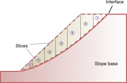 The methods of slices is the most popular limit equilibrium technique. In this approach, the soil mass is discretized into vertical slices.[12][14] Several versions of the method are in use. These variations can produce different results (factor of safety) because of different assumptions and inter-slice boundary conditions.[13][15]
