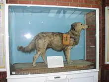 "Station Jim" (or Dog Jim), based at Slough railway station, was a Canine Collector for the Great Western Railway Widows and Orphans Fund from 1894 until his death in 1896.[19] After his death he was stuffed and placed on display in a glass cabinet with a collection slot.[20][21] Station Jim's display cabinet, which can be found on Platform 5, includes a copy of the original inscription, written after he died, that describes his life story: