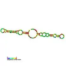 In molecular biology, for Homo sapiens snoRA35 (also known as HBI-36) is an H/ACA box snoRNA, first cloned from a mouse adult brain cDNA library by Cavaillé et al. (2000),[1] and found to be specifically expressed in the choroid plexus. Its human orthologue, HBI-36 was discovered by a homology search, and was found to be specifically expressed in the brain. Its gene resides in the second intron of the serotonin receptor 2c (5HT-2c) gene, which is predominantly expressed in choroid plexus epithelial cells. The human 5HT-2c mRNA was predicted to be 2'O-methylated by the C/D box snoRNP HBII-52 at a position also subjected to A:I editing. HBI-36 has no documented RNA target.