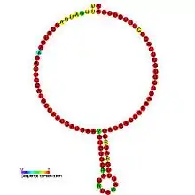 In molecular biology,snoRNA snR53 is a non-coding RNA (ncRNA) molecule which functions in the modification of other small nuclear RNAs (snRNAs). This type of modifying RNA is usually located in the nucleolus of the eukaryotic cell which is a major site of snRNA biogenesis. It is known as a small nucleolar RNA (snoRNA) and also often referred to as a guide RNA. snoRNA snR53 belongs to the C/D box class of snoRNAs which contain the conserved sequence motifs known as the C box (UGAUGA) and the D box (CUGA). Most of the members of the box C/D family function in directing site-specific 2'-O-methylation of substrate RNAs.[1] snoRNA snR53 was initially discovered using a computational screen of the Saccharomyces cerevisiae genome.[2]
