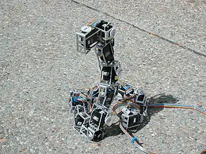 The SnakeBot, also known as a snake robot, is a biomorphic hyper-redundant robot that resembles a biological snake. Snake robots come in many shapes and sizes, from as long as four stories (earthquake SnakeBot developed by SINTEF[1]) to a medical SnakeBot developed at Carnegie Mellon University that is thin enough to maneuver around organs inside a human chest cavity. Though SnakeBots can very greatly in size and design, there are two qualities that all SnakeBot share. The small cross-section-to-length ratios allow them to move into and maneuver through tight spaces and their ability to change the shape of their bodies allows them to perform a wide range of behaviors, such as climbing stairs or tree trunks. Additionally, many snake robots are constructed by chaining together several independent links. This redundancy can make them resistant to failure because they can continue to operate even if parts of their body are destroyed. Properties such as high terrainability, redundancy, and the possibility of complete sealing of the body of the robot, make snake robots very interesting for practical applications and hence as a research topic.[2][3] A SnakeBot is different from a snake-arm robot in that the SnakeBot robot types are usually more self-contained, where a snake-arm robot usually has remote mechanicals from the arm itself, possibly connected to a larger system.