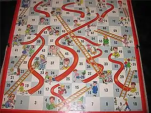The game is a simple race based on sheer luck, and it is popular with young children.[2] The historic version had its roots in morality lessons, on which a player's progression up the board represented a life journey complicated by virtues (ladders) and vices (snakes). The game is also sold under other names such as Chutes and Ladders, Bible Ups and Downs, etc., some with a morality motif;[3] a morality-themed Chutes and Ladders was published by the Milton Bradley Company starting from 1943.