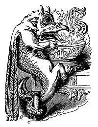 In the English play Lingua (1607) the practice is said to come from classical antiquity: "When Hercules had killed the flaming dragon of Hesperia with the apples of that orchard, he made this fiery meat; in memory whereof he named it Snapdragon."[21] Brooks' Master Sandy's Snapdragon suggests another mythical origin, relating the fire of snap-dragons to Saint George and the dragon.[9] Chambers suggests that it hearkens back to druidic fire-worship.[10] According to the Oxford English Dictionary entry for flapdragon, "the original sense may have been identical with a dialectal sense of snapdragon, viz. a figure of a dragon's head with snapping jaws, carried about by the mummers at Christmas; but of this there is no trace in our quot[ation]s".[4]