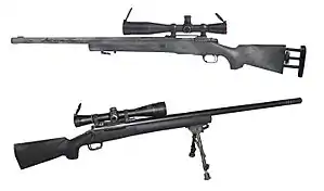 A sniper rifle is a high-precision, long-range rifle. Requirements include high accuracy, reliability, and mobility, concealment, and optics, for anti-personnel, anti-materiel and surveillance uses by military snipers. The modern sniper rifle is a portable shoulder-fired rifle with either a bolt action or semi-automatic action, fitted with a telescopic sight for extreme accuracy and chambered for a high-ballistic performance centerfire cartridge.