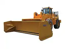Snow pusher designs vary across the industry. They are typically between 3 ft [0.9 m] and 5.5 ft [1.6 m] high and range from 6 ft [1.8 m] to 40 ft [12.2 m] wide. Snow pushers are typically mounted on wheel loaders, skid steers, or backhoes. For wheel loaders and backhoes, they are mounted using a universal mounting system that consists of a set of posts (or plates) between which the machine bucket is placed. Chains are attached to the snow pusher and the bucket and tightened using a chain binder. This system allows for snow pushers to be mounted on any machine without regard for brand-specific mounting brackets. Skid steer loaders can use the universal mounting system;[1] however, most manufacturers typically offer skid steer snow pushers with a universally accepted quick-attach system. Though the snow pusher might seem like a simple product, there are many variations across the industry in areas such as moldboard height and angle, sidewall support system (post, wedge, or unsupported), trip edge system, shoe thickness, and rubber cutting edge quality, to name a few.
