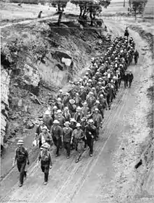 'Maitlands Own' Battalion, the 34th, was formed from a core of men who had commenced a recruitment march at Narrabri on 8 December 1915 and finished in Newcastle on 8 January 1916. Forty-three men began the march and 281 miles later there were 265 new recruits.[10][11][12]