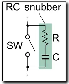 A simple RC snubber uses a small resistor (R) in series with a small capacitor (C).[1] This combination can be used to suppress the rapid rise in voltage across a thyristor, preventing the erroneous turn-on of the thyristor; it does this by limiting the rate of rise in voltage ( ) across the thyristor to a value which will not trigger it. An appropriately designed RC snubber can be used with either DC or AC loads. This sort of snubber is commonly used with inductive loads such as electric motors. The voltage across a capacitor cannot change instantaneously, so a decreasing transient current will flow through it for a fraction of a second, allowing the voltage across the switch to increase more slowly when the switch is opened. Determination of voltage rating can be difficult owing to the nature of transient waveforms, and may be defined simply by the power rating of the snubber components and the application. RC snubbers can be made discretely and are also built as a single component (see also Boucherot cell).