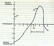 Developed in the 1960s, the return potential model provides a method for plotting and visualizing group norms. In the regular coordinate plane, the amount of behavior exhibited is plotted on the X-axis (label a in Figure 1) while the amount of group acceptance or approval gets plotted on the Y-axis (b in Figure 1).[45] The graph represents the potential return or positive outcome to an individual for a given behavioral norm. Theoretically, one could plot a point for each increment of behavior how much the group likes or dislikes that action. For example, it may be the case that among first-year graduate students, strong social norms exist around how many daily cups of coffee a student drinks. If the return curve in Figure 1 correctly displays the example social norm, we can see that if someone drinks 0 cups of coffee a day, the group strongly disapproves. The group disapproves of the behavior of any member who drinks fewer than four cups of coffee a day; the group disapproves of drinking more than seven cups, shown by the approval curve dipping back below zero. As seen in this example, the return potential model displays how much group approval one can expect for each increment of behavior.