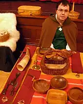 The minimum standard for attendance at an SCA event is "an attempt at pre-17th century clothing",[19] and there is a general goal of maintaining a historical atmosphere. However, SCA members will use modern elements when necessary for personal comfort, medical needs, or to promote safety (e.g. wearing prescription eye-wear, using rattan for swords or shear thickening substances for padding). Unlike some other living history groups, most SCA gatherings do not reenact a specific time or place in history, leaving members free to dress as any culture within the SCA's time period.[20][21]
