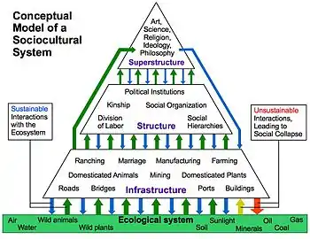 In 1979, Marvin Harris outlined a universal structure of sociocultural systems. He mentioned infrastructure (production and population), structure (which is behavioural, like corporations, political organizations, hierarchies, castes), and a superstructure (which is mental, like beliefs, values, norms).[3][4]