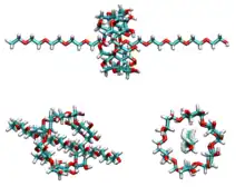 Host-guest complex of polyethylene glycol oligomer bound within an α-cyclodextrin molecule; a common scaffold used in the formation of gels. The atoms are colored such that red represents oxygen, cyan represents carbon, and white represents hydrogen.