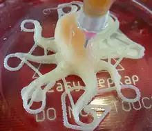 Additive manufacturing processes such as 3D printing can now be used to print a wide range of silicone inks using techniques such as direct ink writing (DIW, also known as Robocasting).[12] This manufacturing route allows for a seamless production of fluidic elastomer actuators with locally defined mechanical properties. It further enables a digital fabrication of pneumatic silicone actuators exhibiting programmable bioinspired architectures and motions.[13] A wide range of fully functional soft robots have been printed using this method including bending, twisting, grabbing and contracting motion. This technique avoids some of the drawbacks of conventional manufacturing routes such as delamination between glued parts. Another additive manufacturing method that produces shape morphing materials whose shape is photosensitive, thermally activated, or water responsive. Essentially, these polymers can automatically change shape upon interaction with water, light, or heat. One such example of a shape morphing material was created through the use of light reactive ink-jet printing onto a polystyrene target.[14]