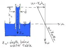 Due to surface tension, water will rise up in a small capillary tube above a free surface of water. Likewise, water will rise up above the water table into the small pore spaces around the soil particles. In fact the soil may be completely saturated for some distance above the water table. Above the height of capillary saturation, the soil may be wet but the water content will decrease with elevation. If the water in the capillary zone is not moving, the water pressure obeys the equation of hydrostatic equilibrium, , but note that , is negative above the water table. Hence, hydrostatic water pressures are negative above the water table. The thickness of the zone of capillary saturation depends on the pore size, but typically, the heights vary between a centimeter or so for coarse sand to tens of meters for a silt or clay.[3] In fact the pore space of soil is a uniform fractal e.g. a set of uniformly distributed D-dimensional fractals of average linear size L. For the clay soil it has been found that L=0.15 mm and D=2.7.[20]