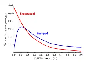 where h is soil thickness [m], P0 [mm/year] is the potential (or maximum) weathering rate of bedrock and k [m−1] is an empirical constant.[1]