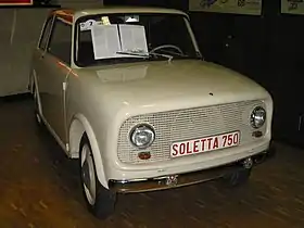The Soletta 750 debuted at the 1956 Geneva Motor Show. It appeared later that same year at the Paris Motor Show with revised bodywork.[3] The reaction of the international press to the car was surprised but generally positive.[5][4] The Soletta 750 was viewed by Sir Alec Issigonis, future designer of the Mini, at the 1956 Paris Show.[1] He remarked that there was a market for four-place concepts like the Soletta 750.[5]