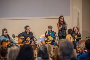 In 2008, Austin-based singer/songwriter Darden Smith performed at the Landstuhl Regional Medical Center in Germany for American soldiers injured in Iraq and Afghanistan. After returning home, he met with members of the Texas National Guard and learned about Angel Flights, a program in which pilots fly fallen service members home to the United States. Smith contacted a longtime friend, singer-songwriter Radney Foster, and together they wrote a song called "Angel Flight," which Foster recorded on his CD Revival (2009).[1] Smith was invited to write with veterans for LifeQuest Transitions, a group that helped wounded veterans with their transition to civilian life.[2] Mary Judd, a writer and developer of special programs, accompanied him on this visit with the intention of writing an article. When the two saw the impact of collaborative songwriting on the veterans, Judd began developing the full retreat programming around the songwriting sessions. SongwritingWith:Soldiers officially launched in 2012.[3][4]
