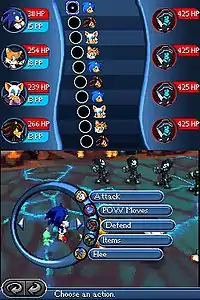 Combat gameplay occurs when enemies are walked into, shifting the view to a close-up for turn-based battles to occur. Standard attacks are available, while special attacks, dubbed POW Moves, can be performed by rhythmically tapping the stylus. These will use up POW Points, in a manner similar to Magic Points in other RPGs.[2][5][6] Examples of individual special attacks include Sonic's Axe Kick and Whirlwind, while some group-based special attacks require certain characters in the party, such as the Blue Bomber, which requires both Sonic and Tails.[4] After combat is complete, loot is available, ranging from healing items to character equipment - equippable in one of three slots per character - while experience points boosts up to two of four attributes per character: speed, attack, defense, and luck.[2]