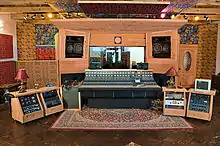 The Stone Room is a five-sided room made of travertine stone, with a slanted latia ceiling which optimizes acoustic diffusion.[9][10] When stripped of baffles and carpets, it serves as an echo chamber during mixdown. The center tracking room, leading to the Drum Room, has carpets and absorbable material between the traditional vigas in the ceiling structure which shortens the decay time in the room and makes it suitable for vocals and electric guitar tracking.