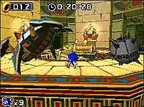 Sonic Rush is a 2D platform game, similar to earlier games in the series as well as later ones like Sonic Advance and Sonic Mania. The player controls either Sonic the Hedgehog or Blaze the Cat, who differ in terms of special abilities.[3] In the tradition of past Sonic games, gameplay consists of moving quickly through levels, collecting rings and defeating enemies.[4][5][6] The player collects rings as a form of health; when they are attacked by an enemy or harmful obstacle, their rings bounce in all directions. The player starts the game with a certain number of lives, which are lost when they are hit without any rings in their possession, get crushed, drown, fall into a bottomless pit, or exceed an act 10-minute limit. The game ends when the player loses their last life. Both of the DS's screens are used to display the play area, with the player's character moving between them as necessary.[4][7] Levels in the game are divided into "zones", each consisting of two acts of normal gameplay then a 3D boss battle. The course of the game differs depending on whether Sonic or Blaze is chosen;[8] the seven zones are the same, but are accessed in different orders.[3] During boss battles, Blaze fights Doctor Eggman[9] and Sonic fights an Eggman doppelgänger called Eggman Nega.[7][10] As the characters' stories progress, they meet each other several times and unite in the final zone that comes after the seventh.[8] The game features special stages the player can access via certain handles in order to obtain the Chaos Emeralds. These Special Stages resemble those of Sonic the Hedgehog 2 and use the DS' stylus controls.[11]