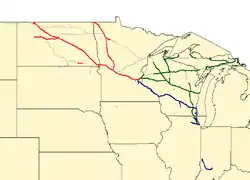 ![]() Map of the Soo Line Railroad. Red lines are former SOO trackage operated by CPKC; dark blue lines are former MILW trackage also now operated by CPKC; green lines are former SOO trackage spun off to WC and now part of CN. Grey lines in North Dakota are operated by Short Lines (DMVW and NPR) and dotted light blue lines are abandoned. | |