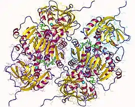 The interactions between subunits forming a tetramer in SDH is determined by non-covalent interaction.[5] These non-covalent interactions consists of a hydrophobic effect, hydrogen bonds, and electrostatic interactions between the four identical subunits. For homotetrameric proteins such as SDH, the structure is believed to have evolved going from a monomeric to a dimeric and finally toward a tetrameric structure in evolution. The SDH proteins have a close evolutionary relationship with alcohol dehydrogenase, which also belongs to the protein superfamily of medium-chain dehydrogenase/reductase enzymes (MDRs). Mammalian ADHs are all dimeric enzymes but certain bacterial ADHs also share a tetrameric quaternary structure. SDH from silver leaf whitefly and that from yeast ADH1 both lack a structural zinc site and share a tetrameric quaternary structure, thus showing a close evolutionary relationship from a structural viewpoint between the two classes of proteins (ADH and SDH).[5]