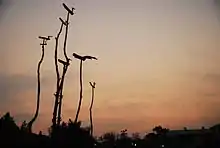 The shape of birds on sotdae was carved as minutely as possible but it was sometimes simplified to just Y or ㄱ shape. The number of birds seated on sotdae was different from village to village, from one to three. Commonly one bird was seated on a pole, but sometimes two or three birds on a Y-shape branch were found on a pole — either facing each other or facing the same direction. Nothing is exactly known concerning the number of birds but it is assumed that the number of birds on a pole was decided according to the number of places which 'qi' should be complemented.[8] The direction of the bird's heads varies. People made sotdae erected toward south to wish moderate weather for farming or let it direct north to bring rain. Sometimes sotdae turned toward the outside of the village to make sure that ducks take all the evil spirits and fly away.[8][9]