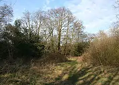 The woodland predominantly dates from the past 40 years, although there are some mature oaks and other trees. The main species are common alder (Alnus glutinosa), pedunculate oak (Quercus robur), silver birch (Betula pendula) and willow (Salix), with common bramble (Rubus fruticosus) predominant in the undergrowth.[2]