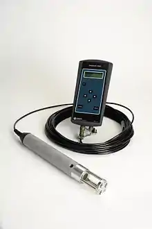 A sound velocity probe is a device that is used for measuring the speed of sound, specifically in the water column, for oceanographic and hydrographic research purposes.
