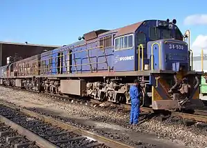 Some problems were experienced using this configuration and after a couple of major derailments, the locomotive configuration was changed to four sets, with locomotive set D initially made up of two Class 34 diesel-electric locomotives at the rear end of the train, pushing at between 40% and 50% of tractive power at all times, depending on the grades being traversed. The total maximum number allowed was still between nine and twelve locomotives per train.[3][10]