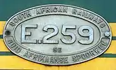 The traditional number plates on the sides of SAR locomotives were usually in a perfect oval shape and were usually cast in a leaded bronze. On the Class 5E, Series 1, however, the plates were in an oval shape with blunted ends and were cast in aluminium.[4]