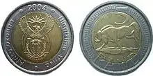 In an effort to curb counterfeiting, a new 5-rand coin was released in August 2004. Security features introduced on the coin include a bimetal design (similar to the €1 and €2 coins, the Thai ฿10 coin, the pre-2018 Philippine ₱10 coin, the British £2 coin, and the Canadian $2 coin), a specially serrated security groove along the rim and microlettering.[30]