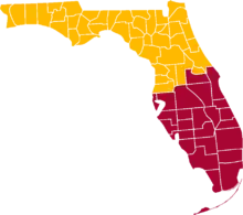 As with all vernacular regions, South Florida has no official boundaries or status and is defined differently by different sources. A 2007 study of Florida's regions by Ary Lamme and Raymond K. Oldakowski found that Floridians surveyed identified "South Florida" as comprising the southernmost sections of peninsular Florida, meaning from Jupiter, Florida, southward. That area includes the Miami metropolitan area (defined as Miami-Dade, Broward, and Palm Beach counties), the Florida Keys, and the interior region known as the Glades. Additionally, Southwest Florida, representing the state's southern Gulf Coast, has emerged as a directional vernacular region. Some respondents from as far northwest as the southern Tampa Bay area identified their region as being in South Florida rather than Southwest or Central Florida.[2] Confusing the matter further, the University of South Florida, named in part because of its status as the state's southernmost public university at the time of its 1957 founding, is located in Tampa.[3] Florida State Road 70 bisects approximately the southern third of Florida from west to east.
