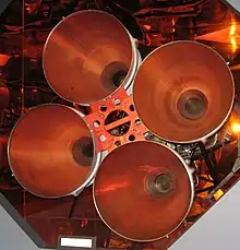 The ability to launch satellites came from the Soviet intercontinental ballistic missile (ICBM) arsenal, using the RD-107 engine for the Vostok launch vehicle. The first Vostok version had 1 core engine and 4 strap-on stage engines. The engines were all vectored thrust capable. The original Vostok was fueled by liquid oxygen and kerosene. There were a total of 20 engines, each capable of contributing 55,000 pounds-force (240 kN) of thrust.[74] The Vostok engine was the first true Soviet design. The technical name was the RD-107 and later the RD-108. These engines had two thrust chambers. They were originally mono-propellant-burning using hydrogen peroxide fuel. This family of engines were utilized not just on the Vostok, but also on the Voskhod, Molniya, and Soyuz launch vehicles.[22]