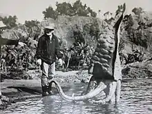 A photographer named Kudo and his entourage land on Selgio Island for a photoshoot, but their camp is attacked by Gezora. Because of its mutation, the creature can create extremely cold temperatures with its body. When the survivors discover that Gezora is vulnerable to high temperatures, Kudo and his friends use a leftover Japanese World War II munitions bunker to set fire to the monster. Severely burned, the creature retreats to the water, where it dies.