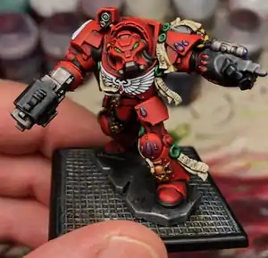 This edition featured new sculpts designed specifically for Space Hulk, instead of being shared with the sets for the tabletop game Warhammer 40,000.[7] Advancements in sculpting and moulding have allowed Games Workshop's Alex Hedström to add a greater level of detail to the miniatures. Each of the twelve miniatures representing Terminators has a distinct appearance, such as Brother Omnio being shown consulting a scanner mounted in his Power Fist. The miniatures representing Genestealers were depicted in various poses, with one bursting up from the floor and another climbing down from the wall. The counters and the board sections of the game were made using new debossing techniques which applied shallow depressions into the cardboard.[5] These board sections were additionally much thicker and heavier than those of previous editions. The Games Workshop studio and box art represents the Blood Angels Space Marine Chapter.[7]