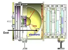 A Dust Telescope is an instrument to perform dust astronomy. It not only analyses the signals and ions that are generated by a dust impact on the sensitive target, but also determines the dust trajectory prior to the impact.[95][96] The latter is based on the successful measurement of the dust electric charge by Cassini's Cosmic Dust Analyzer (CDA).[88][89] A Dust Trajectory Sensor consists of four planes of parallel position sensing wire electrodes.[97] Dust accelerator tests show that dust trajectories can be determined to an accuracy of 1% in velocity and 1° in direction.[98] The second element of a Dust Telescope is a Large-area Mass Analyzer:[99] a reflectron type time-of-flight mass analyzer with a sensitive area of up to 0.2 m2 [100] and a mass resolution R > 150. It consists of a circular plate target with the ion detector behind the center hole. In front of the target is an acceleration grid. Ions generated by an impact are reflected by a paraboloid shaped grid onto the center ion detector. Prototypes of dust telescope have been built at the Laboratory for Atmospheric and Space Physics (LASP) of the University of Colorado, Boulder, USA[101] and at the Institute of Space Systems[102] of the University of Stuttgart, Germany, and tested at their respective dust accelerators.[103]