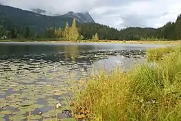 The lake is drained by the Wörschachbach, which flows through the gorge of Wörschach Gorge into the Enns valley. It has a maximum depth of eight metres (26 ft),[1][2] according to other sources eleven metres (36 ft).[3] The lake, which can be as warm as 23 °C (73 °F) in summer, is also used as a swimming lake. On its northern shore is a bathing area and in the middle of the lake a small bathing platform is anchored. In the vicinity of the lake there is the Spechtensee Hut, a mountain hut belonging to the Austrian Alpine Club. There is a circular walk around the lakeside.[3]