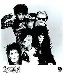 The band was formed in 1981 in Bristol, England by vocalist Olli Wisdom with guitarists Jon Klein (from Europeans) and Kevin Mills (from the X-Certs).[1] Their first show was at a street party celebrating the wedding of Charles, Prince of Wales and Lady Diana Spencer. In 1982, the band relocated to Soho, London, where Wisdom founded the infamous Batcave weekly club-night.[2] Ian Astbury described the band's unique hybrid of punk and glam: "Specimen were very dark, but they were as much German as they were The Addams Family. They were like a Death Bowie."[3][4]