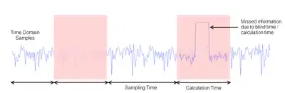 A realtime spectrum analyser does not have any blind time—up to some maximum span, often called the "realtime bandwidth". The analyser is able to sample the incoming RF spectrum in the time domain and convert the information to the frequency domain using the FFT process. FFT's are processed in parallel, gapless and overlapped so there are no gaps in the calculated RF spectrum and no information is missed.
